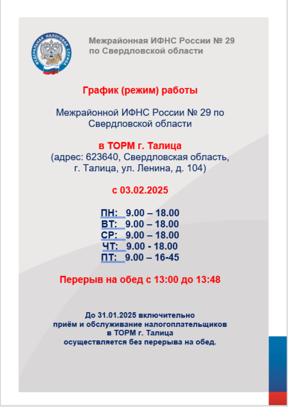 Об изменении с 03.02.2025 графика работы инспекции в ТОРМ г.Талица